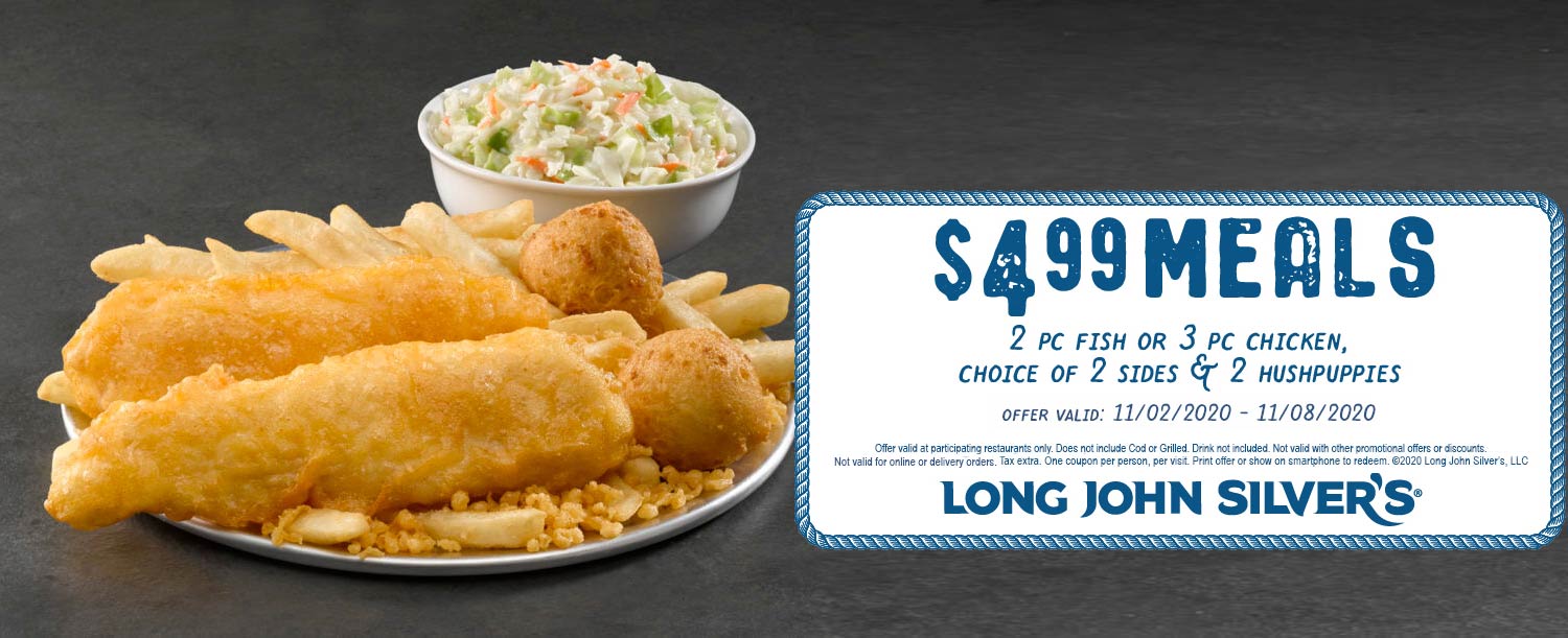 Long John Silver's Offers Discounts & Freebies | Hip2Save In the meantime, you can use the following coupons. Just print them or show them on your phone! $2 off any Variety Platter - Grilled or Fried (exp 9/30) $5 off any 8-Piece Family meal including 2 Family-Size Sides and 8 Hushpuppies (exp 9/30) Have you tried Long John Silver's $10 Sea-Shares? Looking for a dinner idea?