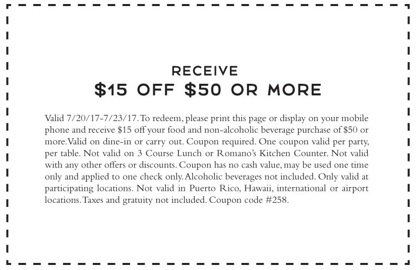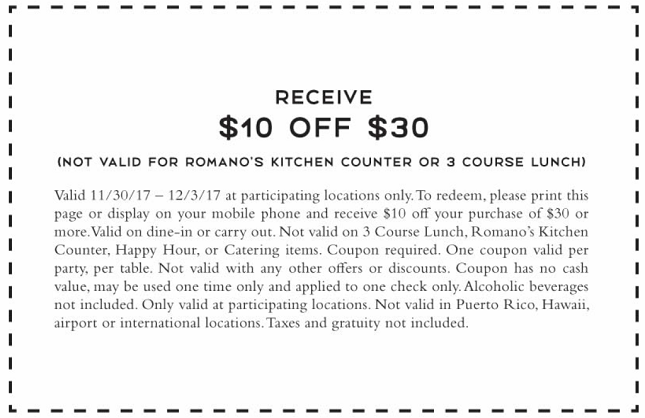 Romano's Macaroni Grill Now Selling Groceries & Meal Kits - Hip2Save Click the Order button to start your online order Click "Feast for Five" or "Premium Feast for Five" and select your entrée, salad, bread and dessert. Click the "Add to Cart" button and head to checkout Final cost $30 or $55 for premium total - just $6 or $11 per person! Prefer to cook at home? Check out our favorite recipes! $15 OFF Mama Romano's Coupons & Promo Deals - Orlando, FL - FriendsEAT Here are a few deals that Mama Romano's in Orlando has offered: Dinner 10% off your total dinner - expired. Early Bird Dinner Special 15% off from 3pm to 5:30pm - Expired. 10% off lunch with printable coupons - Expired. Here are a few things people have to say in reviews about Mama Romano's in Orlando: You gotta go there for the Italian.