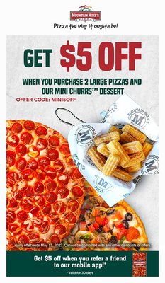 Mountain Mikes Pizza Coupon Code: Upto $3 off sides At participating ... One coupon per person per visit. Not valid with other offers or coupons. Void where prohibited. Coupons not valid at airports, trains, and stadiums. Share: Mountain Mikes Pizza Coupon Codes, Printable coupons, and Promo Codes Food, Beverage, & Restaurant Coupons 7 Coupon Codes Available 4 Online Coupons 3 Coupon Codes added this week Mountain Mike's Pizza Coupons - Save $5 Nov. 2022 Coupon Codes Welcome $5 savings on 2 Medium Pizzas For Takeout and Delivery Orders. Mountain Mike's is the ideal place to order your favorite pizzas! Great offers on everything so browse its menu right now. Benefit from a $5 discount on 2 Medium Pizzas For Takeout and Delivery Purchases! Get this deal immediately!